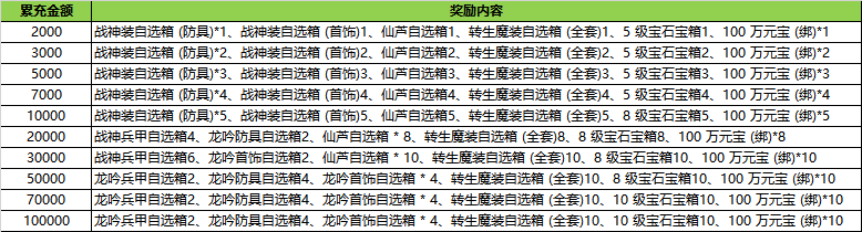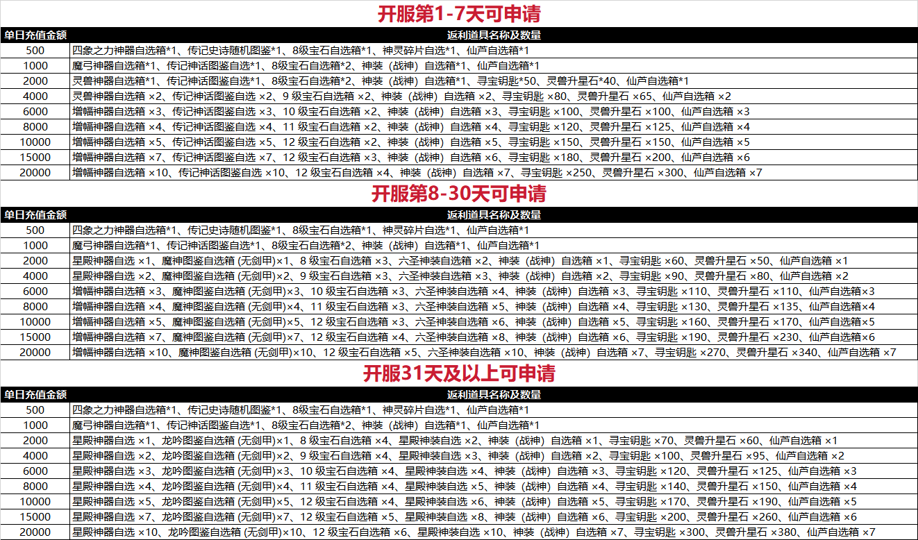 活动内容:单日实际充值达到对应活动标准金额,即可联系客服领取累充返利奖励,每档奖励每个角色每日只能领取一次